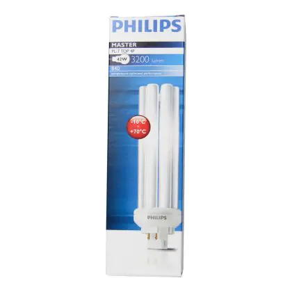 With a colour temperature of 4000K, Philips PL-T TOP 42W 840 4P will provide a cold white light. Philips PL-T TOP 42W 840 4P are very energy efficient: their energy label is classified A. Philips PL-T TOP 42W 840 4P lamps also have a very long lifespan, 13000 hours on average!